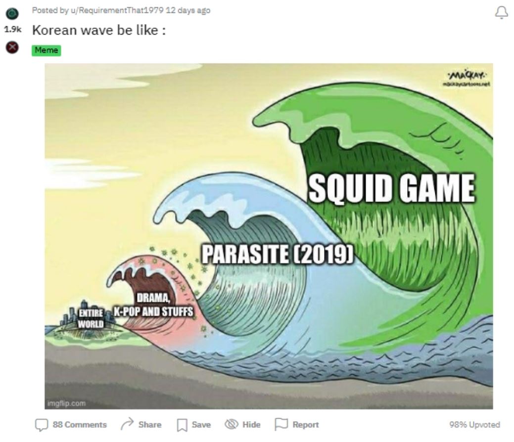 지난 25일, 오징어게임 레딧에 올라온 한류열풍을 비유한 그림과 댓글반응입니다.
